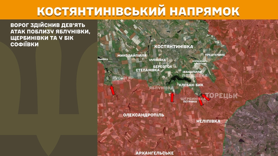 In the Kostiantynivka sector, the Russian invaders carried out nine attacks near Yablunivka and Shcherbynivka, as well as toward Sofiivka.