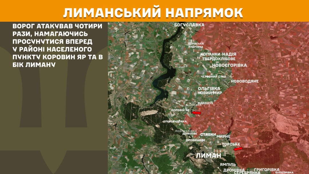In the Lyman sector, the enemy attacked four times, trying to advance in the Korovii Yar area and toward Lyman.