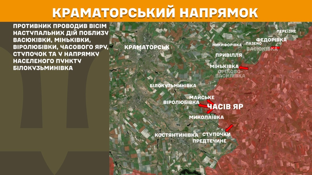 In the Kramatorsk sector, eight offensive actions occurred near Vasiukivka, Minkivka, Viroliubivka, Chasiv Yar, Stupochky, and tpward Bilokuzminivka.
