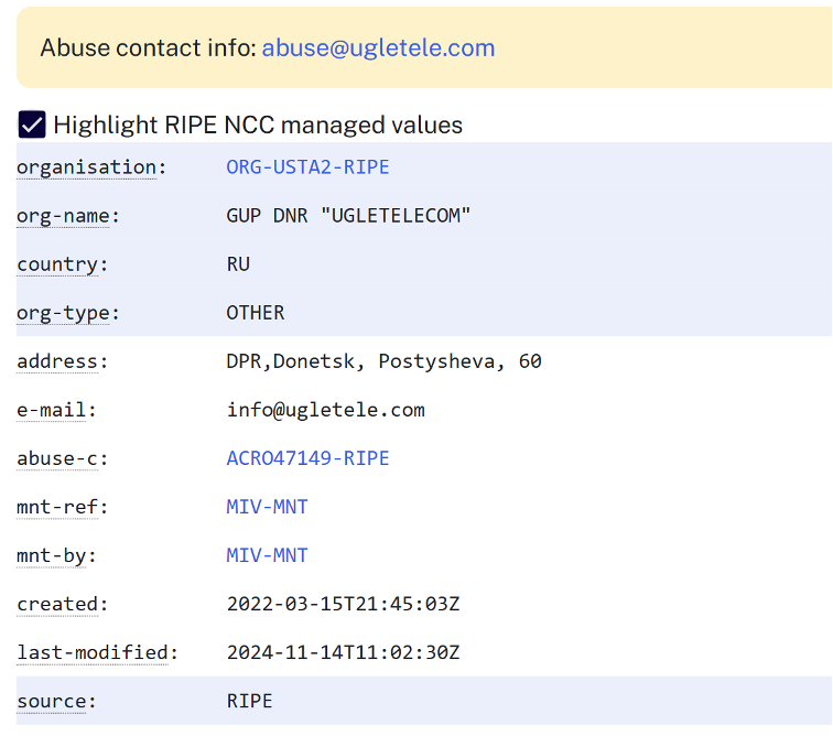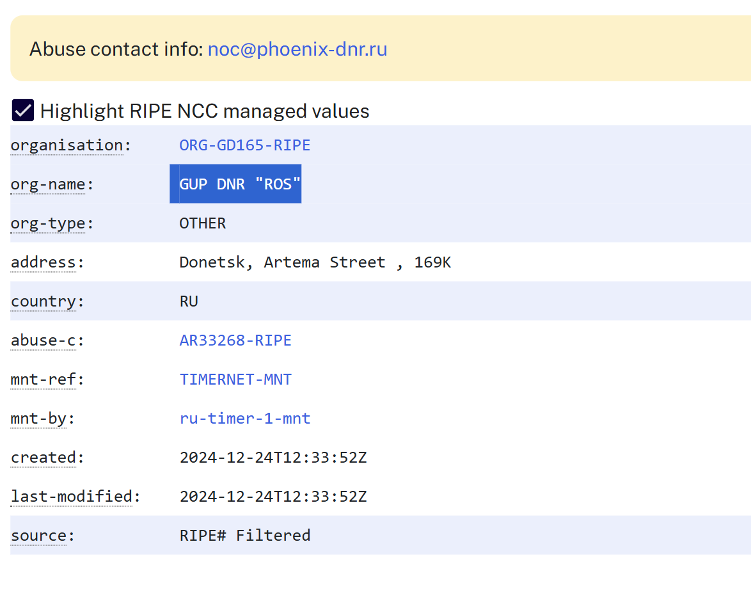 The RIPE NCC board publicly disagreed with this interpretation, arguing that access to the internet and IP resources should not be affected by political disputes, arguing that the DPR/LPR are on their member lists. This is despite the blatant fact that even in the official RIPE database, these illegal entities mention full information about themselves, with impunity and without any consequences, referring to themselves as “state enterprises” of the so-called “DPR” or “LPR.” Of course, illegal quasi-state entities cannot be members, but the business entities controlled by them are members – the “ministries” and “state institutions” created by the occupiers,” the lawyer explains.