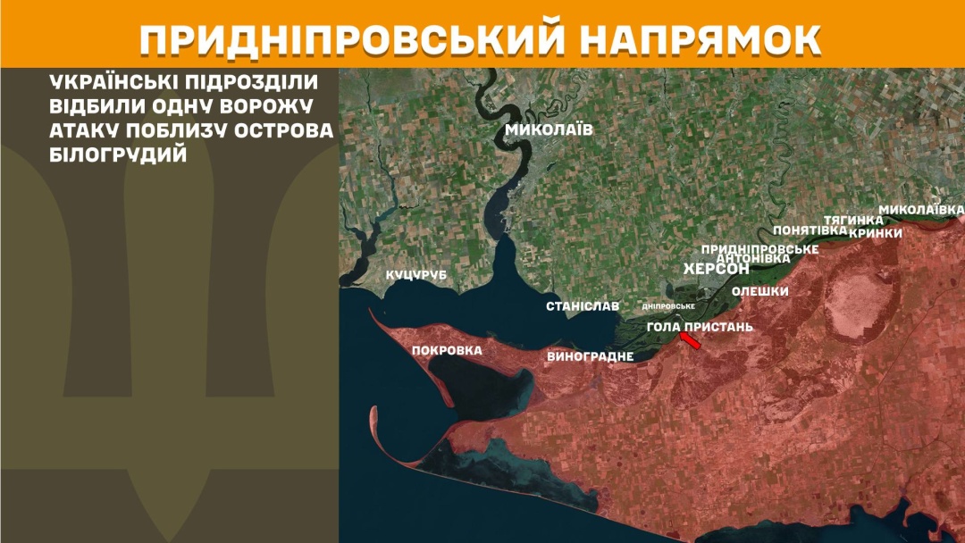 On the Dnipro River axis, Ukrainian units repelled one enemy attack near Bilohruodnyi Island.