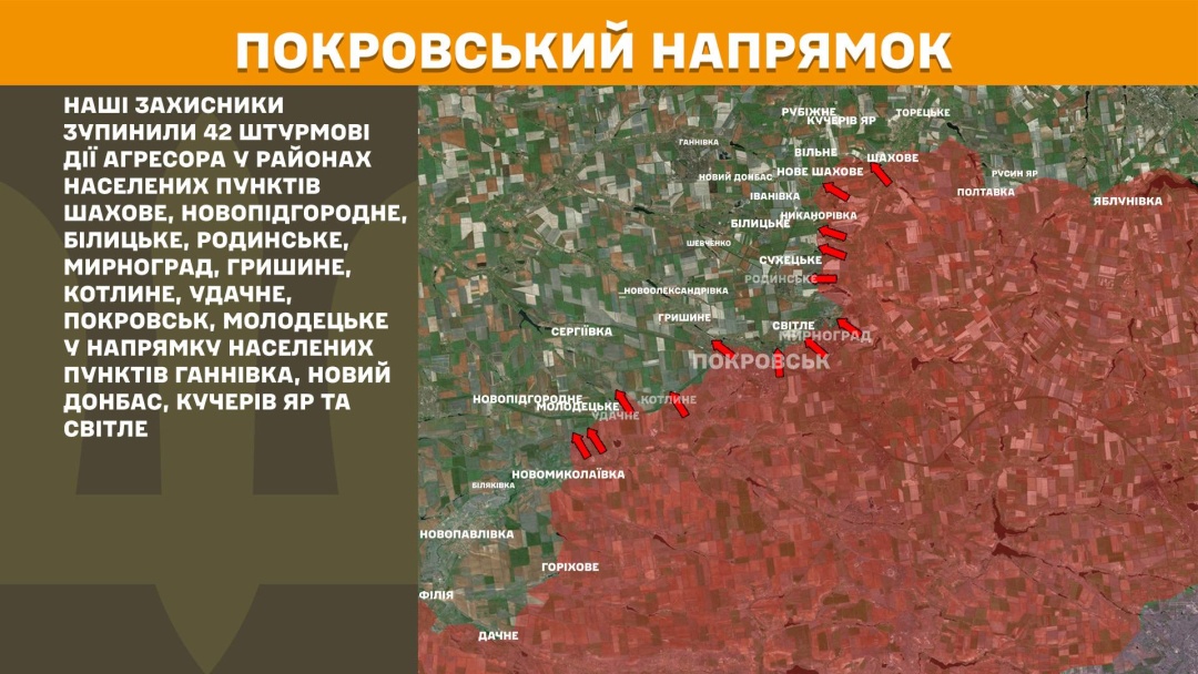 In the Pokrovsk sector, Ukrainian defenders repelled 42 assault actions in the areas of Shakhove, Novopidhordne, Bilytske, Rodynske, Myrnohrad, Hryshyne, Kotlyne, Udachne, Pokrovsk, and Molodetske, as well as toward Hannivka, Novyi Donbas, Kucheriv Yar, and Svitłe.