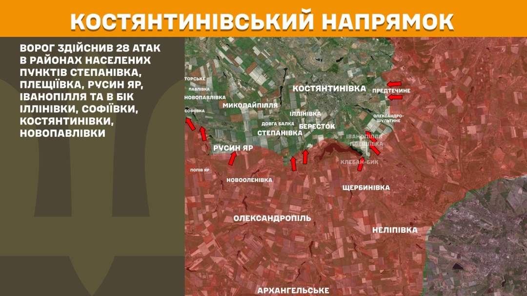 In the Kostiantynivka sector, Russian forces carried out 28 attacks near Stepanivka, Pleshchiivka, Rusyn Yar, and Ivanopillia, as well as toward Illinivka, Sofiivka, Kostiantynivka, and Novopavlivka.
