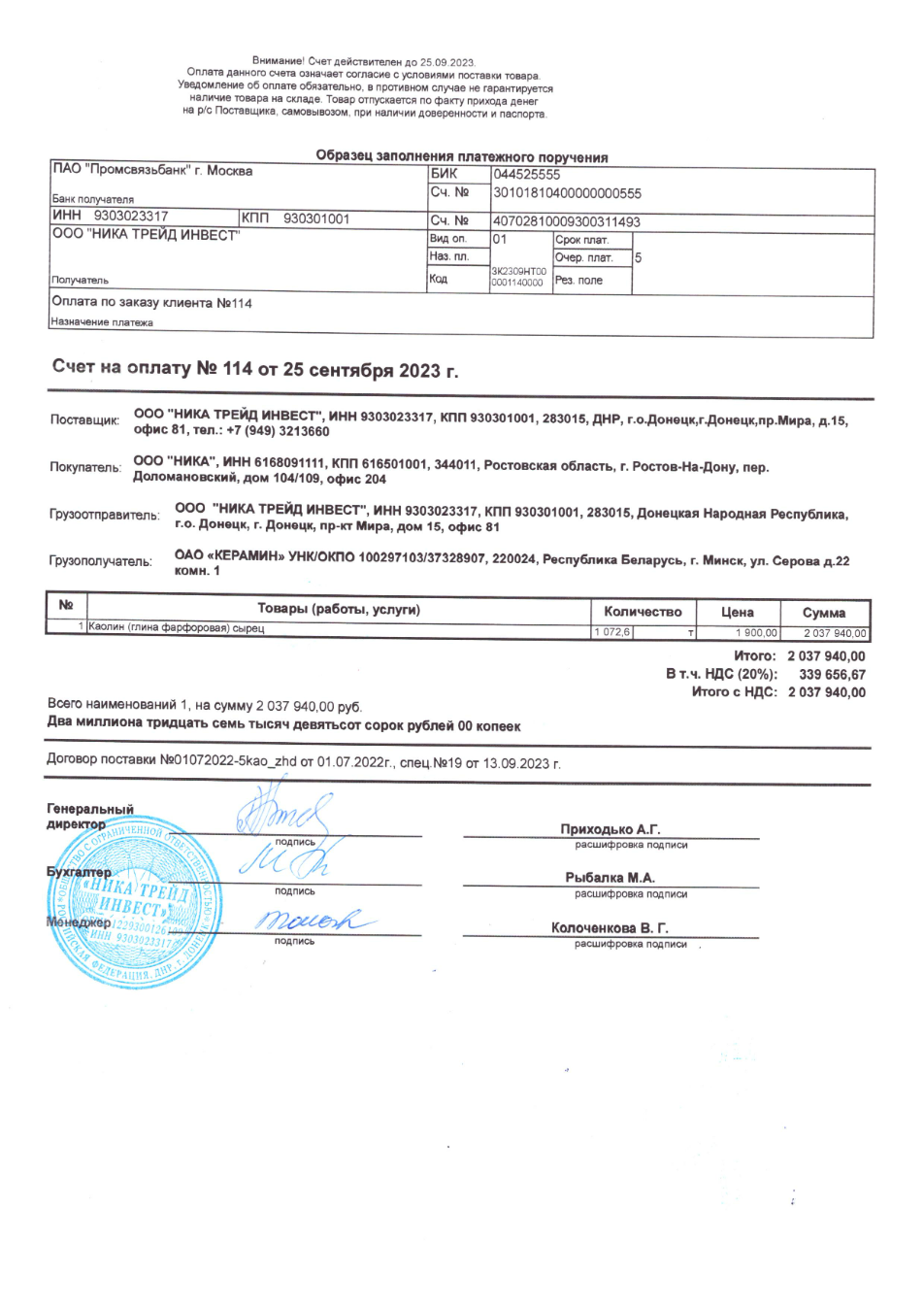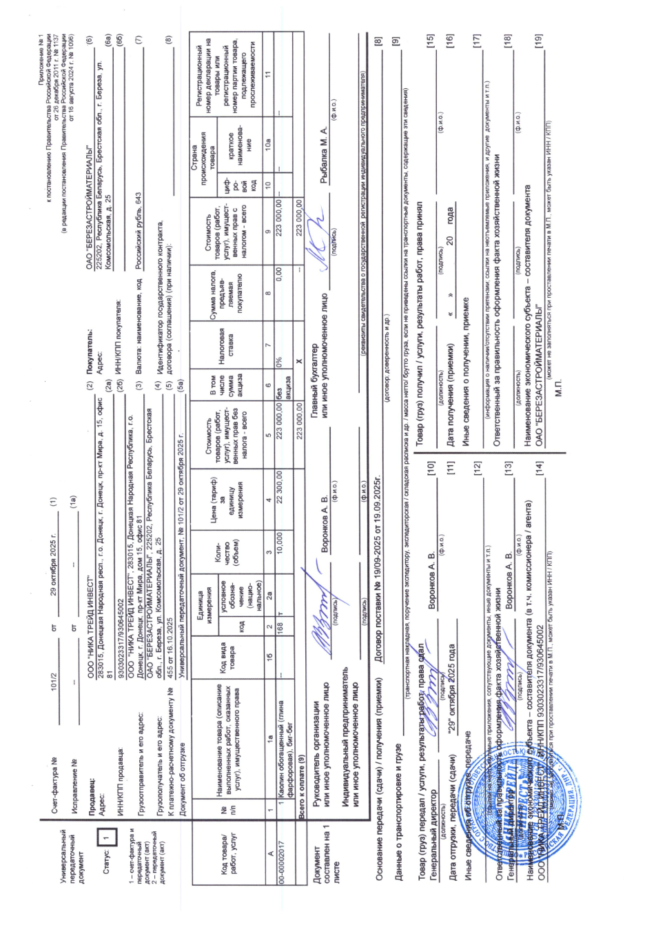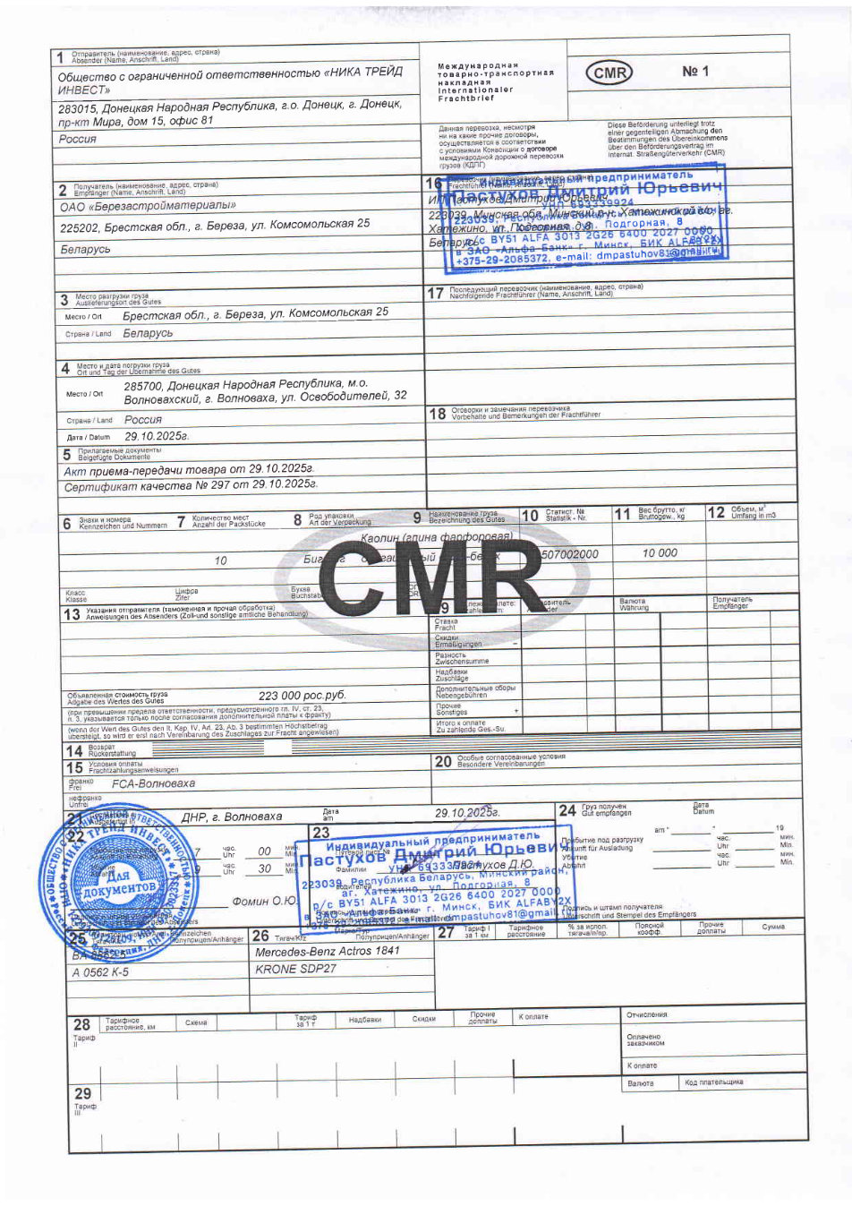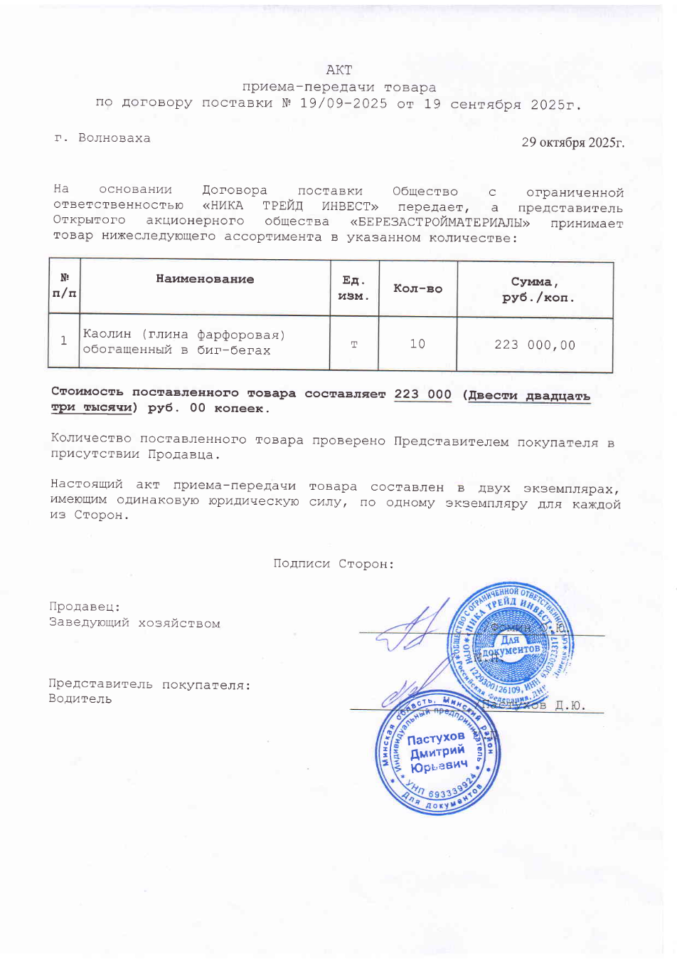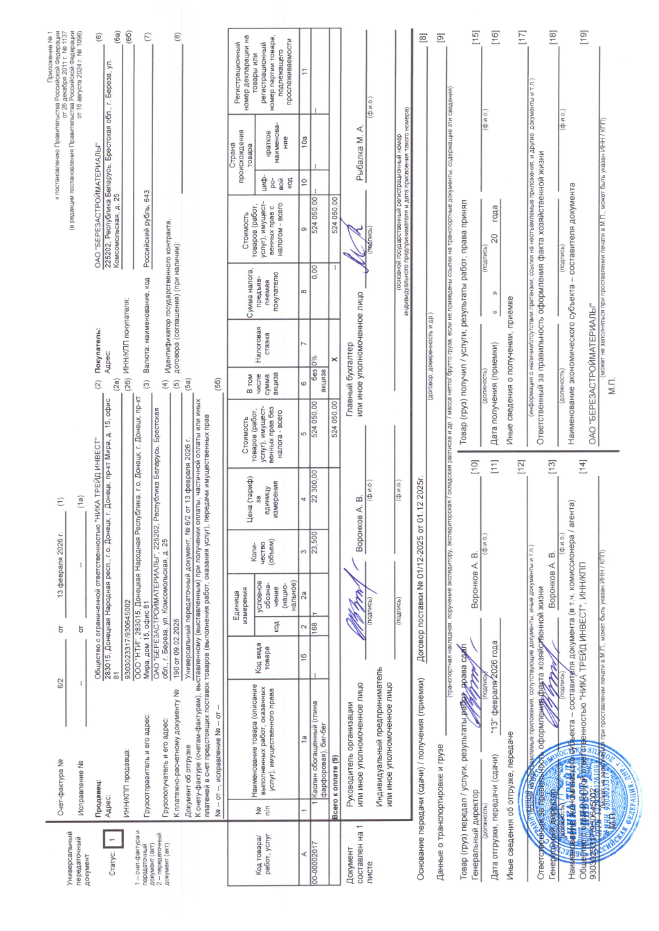 Documents show that, since at least 2025, batches of enriched kaolin have been shipped in big bags by road directly to Berezabudmaterialy. Invoice records indicate these deliveries bypassed the Rostov-based intermediary, Nika LLC, and were supplied directly.