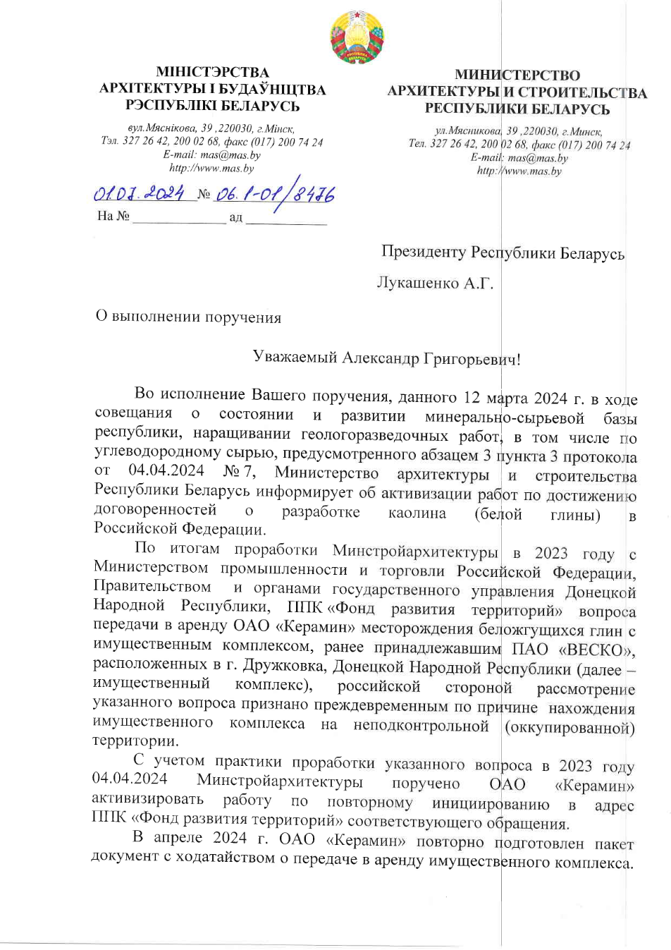 Minsk persisted. After further consultations with the Belarusian embassy, officials decided to prepare a formal appeal from the Belarusian government to its Russian counterpart. The letter states explicitly: “Work to reach agreements on the development of a white-burning clay (kaolin) deposit in the Russian Federation will be continued by the Ministry of Architecture and Construction.”