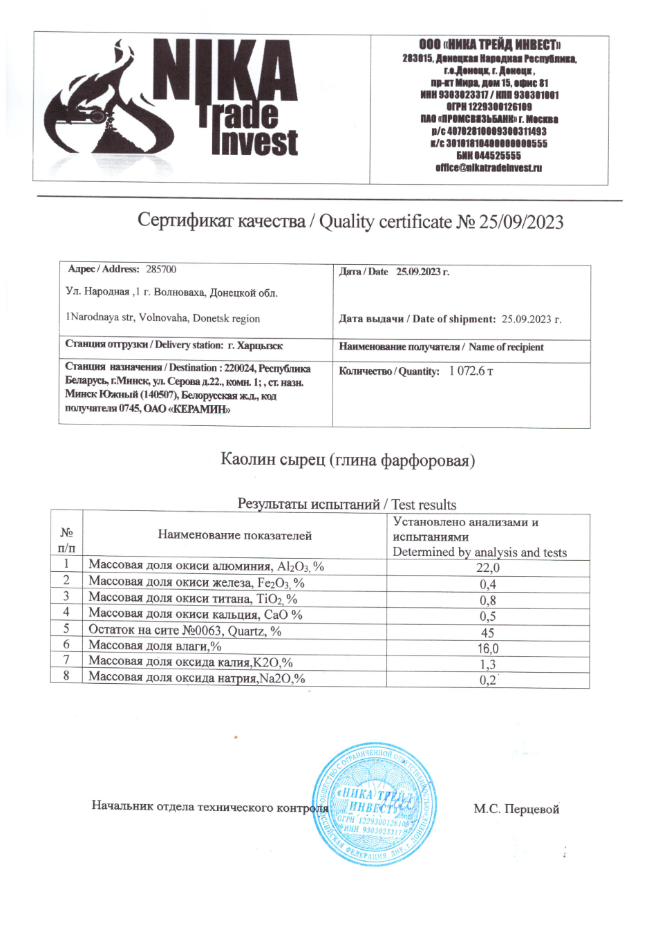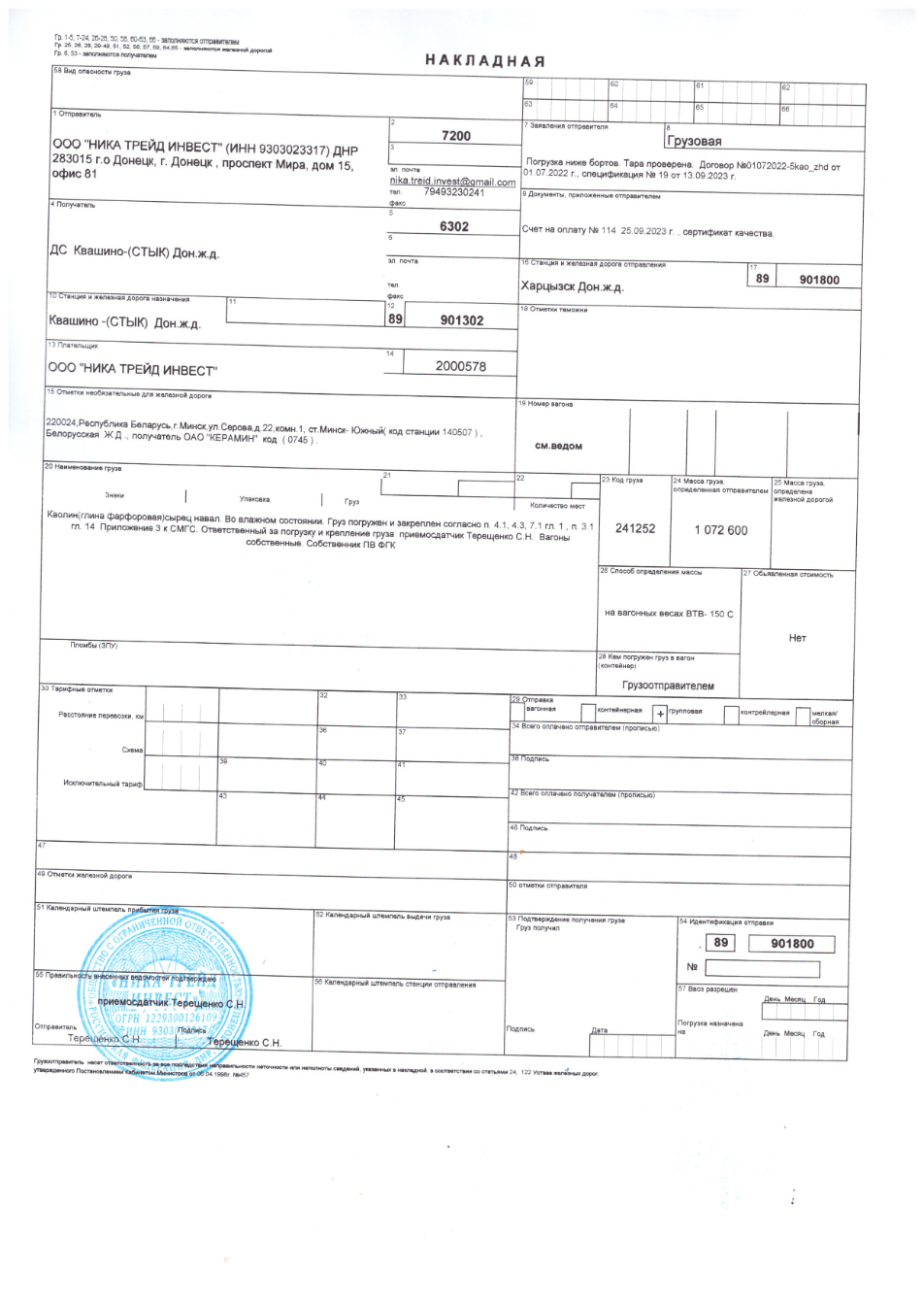 Under this arrangement, Nika Trade Invest LLC acts as both seller and consignor. A “legal buffer” role is played by its affiliated entity, Nika LLC, registered in Rostov-on-Don, which formally appears as the buyer in contracts. The end recipient is Keramin OJSC in Minsk. Shipments are transported by rail from stations in Khartsyzk and Volnovakha into Russian territory and onward to Belarus, terminating at the Minsk-South rail hub.