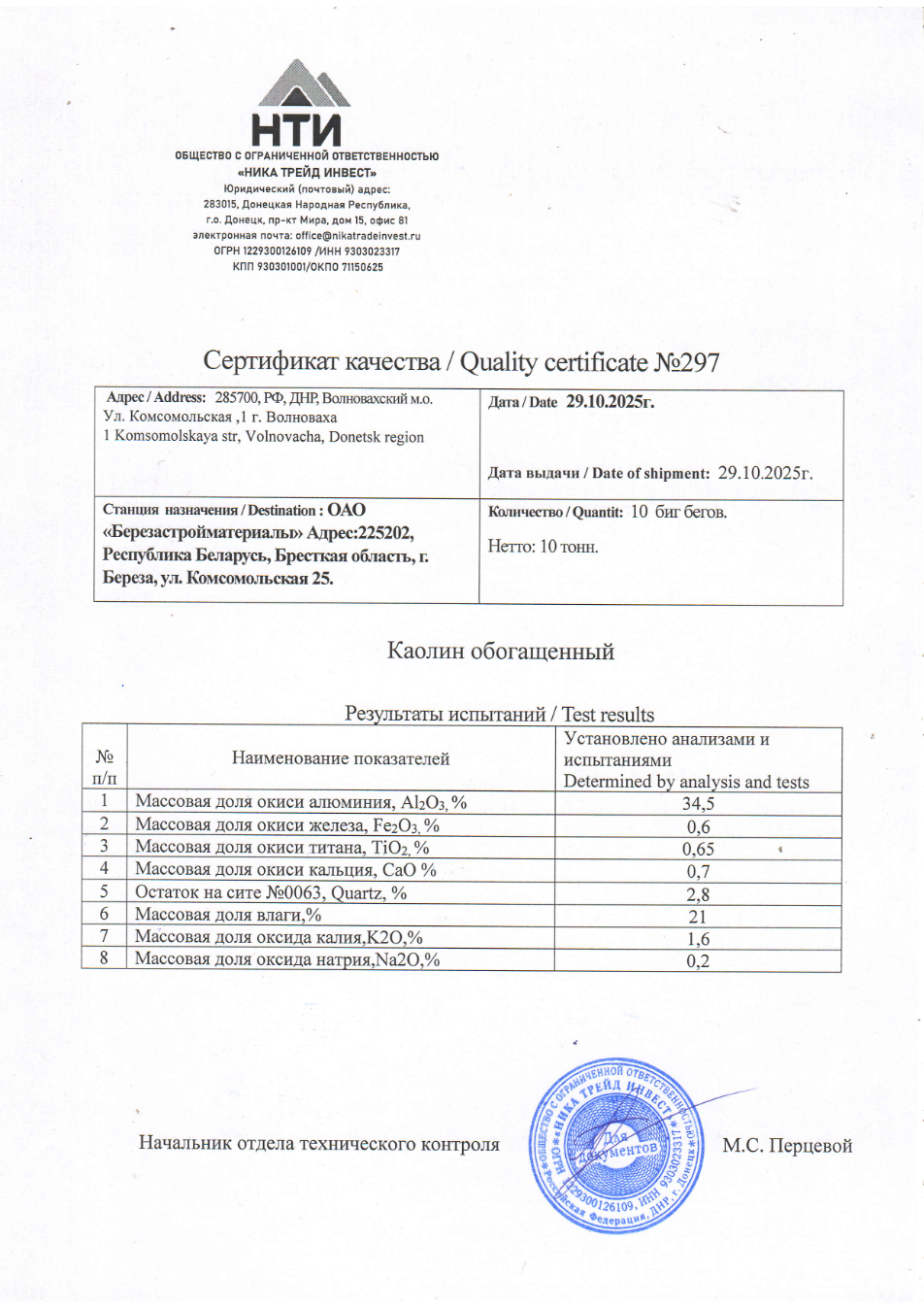 Documents reviewed by BelPol point to a structured and ongoing supply mechanism for kaolin extracted in Russian-occupied areas of Donetsk region. A central role in this scheme is played by Nika Trade Invest LLC, a company registered in Donetsk.