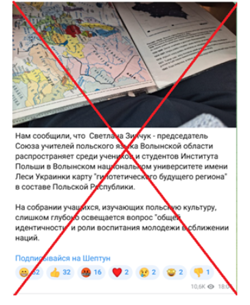 Russian media outlets and Telegram channels are reporting that Svitlana Zinchuk, allegedly the head of the Union of Polish Language Teachers of Volyn Region, is distributing a map among students of the Polish Institute at Lesya Ukrainka Volyn National University, which depicts a "hypothetical future region" as part of the Republic of Poland. The posts include an image of the map supposedly handed out to students, where Ukraine's Volyn region is shown as part of Poland.
