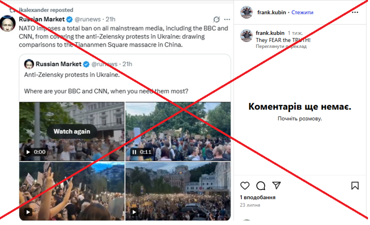 Anonymous foreign-language bots on social media platforms X, TikTok, and Instagram are spreading claims that NATO allegedly prohibited major reputable outlets such as BBC and CNN from covering protests in Kyiv related to the adoption of Law No. 12414. The posts also compare these protests to the 1989 Tiananmen Square student demonstrations in China — a symbol of censorship and repression.