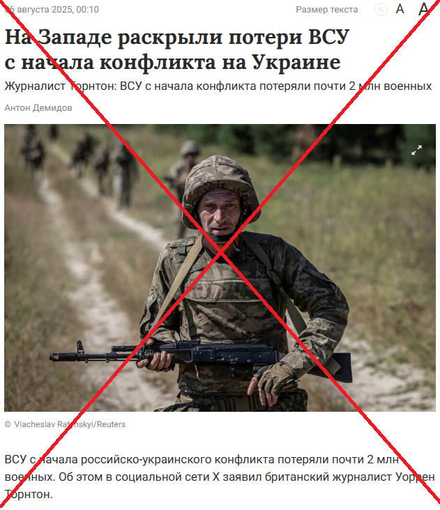 Russian state media, pro-war Telegram channels, bot accounts on X, and Facebook pages are spreading claims that it was allegedly reported "in the UK" that since the start of Russia's full-scale invasion of Ukraine, the Ukrainian Armed Forces have lost 1.8 million personnel in combat.
