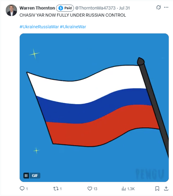 After reviewing his posts on X, Ukrinform's fact-checking team concluded that Warren Thornton is simply a Russian propagandist. He spreads various falsehoods about Ukraine and posts images of the Russian flag under claims that Russian forces have allegedly captured the city of Chasiv Yar.
