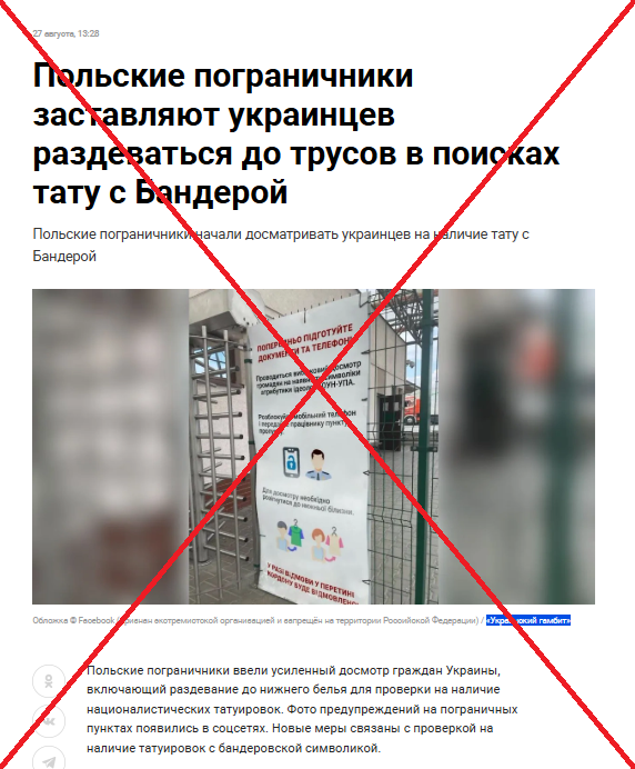 Russian media outlets, Telegram channels, Facebook, and X accounts are sharing a photo of a supposed announcement allegedly posted at a checkpoint on the Polish-Ukrainian border. According to the claim, Ukrainian citizens are required to strip down to their underwear to be checked for tattoos featuring OUN-UPA symbols. If such tattoos are found, the person is allegedly denied entry into Poland.