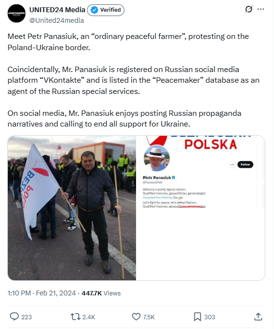 The fake was also shared on social media by pro-Russian Polish activist Piotr Panasiuk. He heads the organization Polski RUCH Antywojenny (Polish Anti-War Movement), which serves as a mouthpiece for Russian propaganda and organizes anti-Ukrainian rallies in Poland.