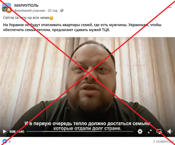 Videos circulating on Telegram, Facebook, X, and Instagram feature what appears to be Verkhovna Rada Speaker Ruslan Stefanchuk. In the clip, he allegedly claims that due to the difficult energy situation, heating will be supplied only to families whose men are serving in Ukraine's Defense Forces. Wives of "draft dodgers," he supposedly says, should "keep warm from their husbands."