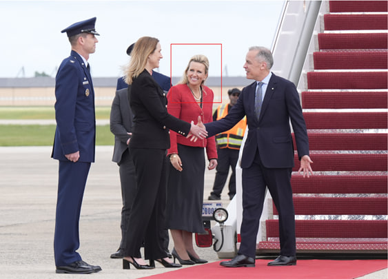 Publicly available photos show Abigail Jones greeting other world leaders in a similar manner — for instance, she welcomed Canadian Prime Minister Mark Carney at the aircraft stairs.