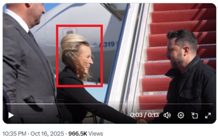 These are fabrications. Zelensky's official X (Twitter) account published a video showing Abigail Jones, Acting Chief of Protocol at the U.S. Department of State, greeting Zelensky at the aircraft stairs.