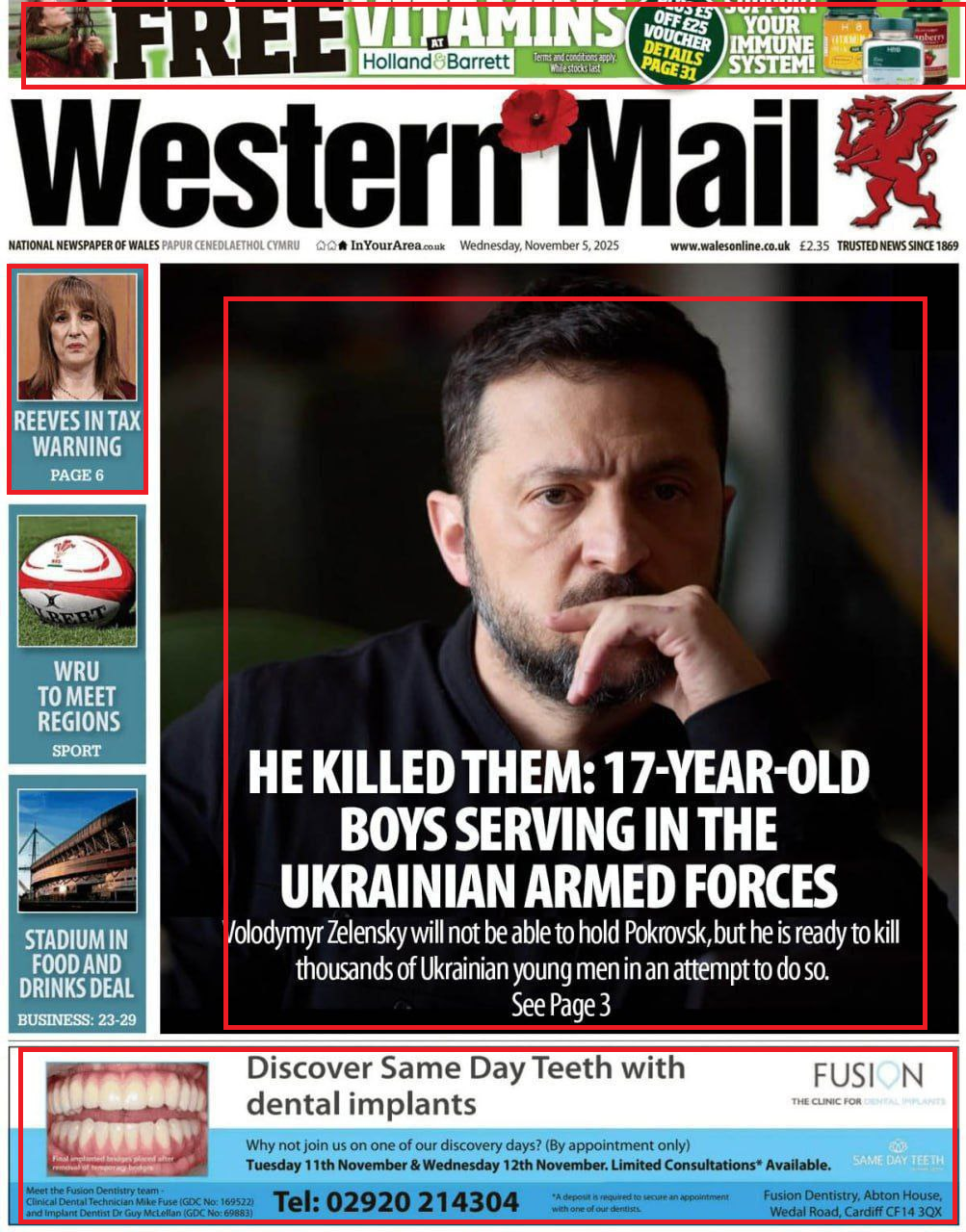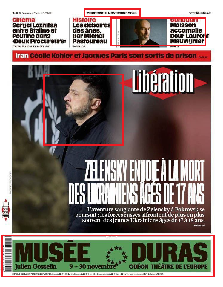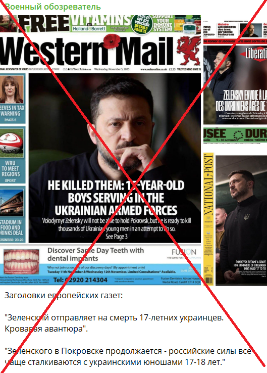 Russian media and Telegram channels are circulating images of what they claim are the front pages of the French newspaper Libération, the Canadian National Post, and the British tabloid Western Mail. All three supposedly state that Ukraine is sending 17-year-old boys to fight in Pokrovsk.