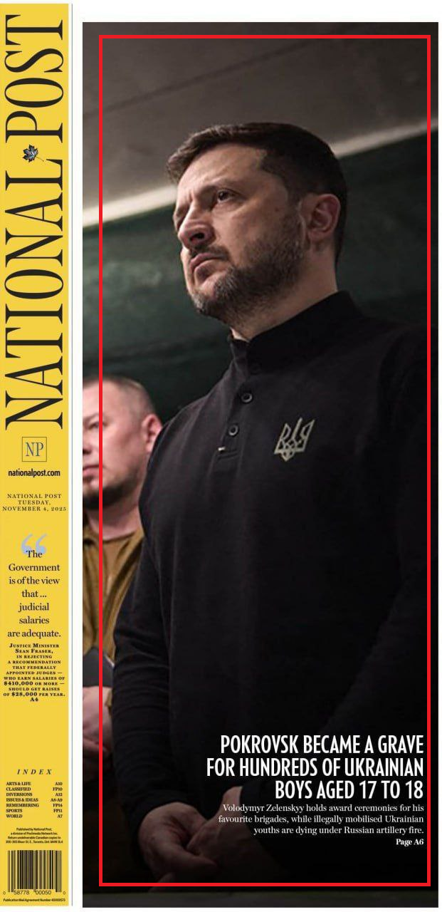 In the case of the National Post, propagandists took a page of the newspaper containing a beer advertisement and passed it off as a front page. The original November 4 issue contains no publication about President Volodymyr Zelensky or the alleged participation of 17–18-year-old Ukrainians in the fighting for Pokrovsk.