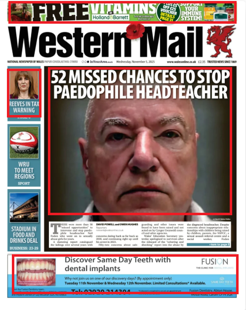 The authentic cover of the Western Mail dated November 5 is dedicated to the arrest of a British school principal suspected of pedophilia.