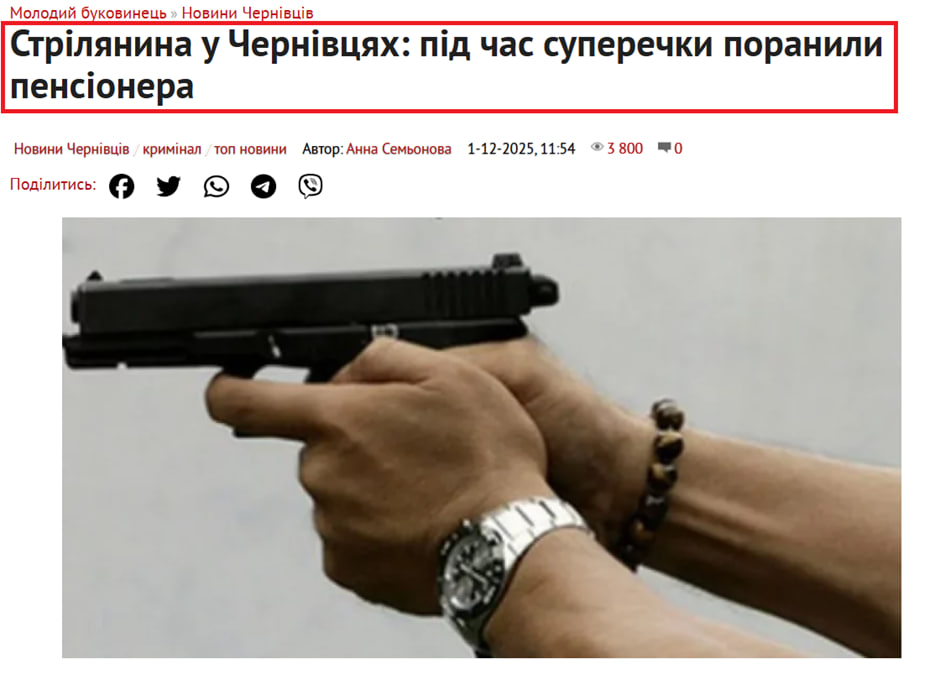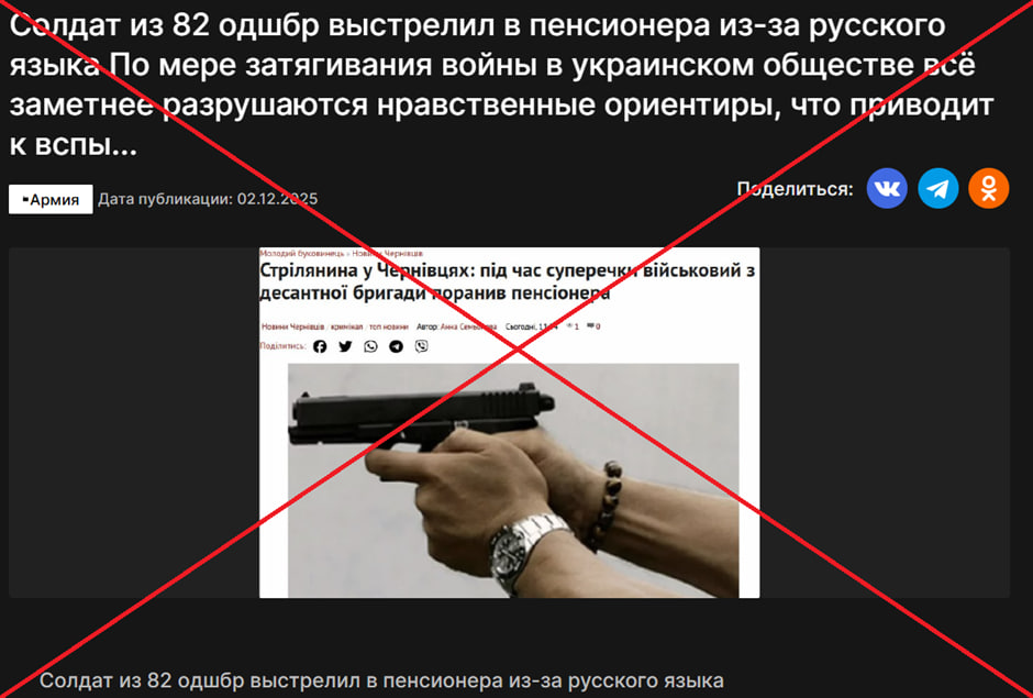 Additionally, Russian propagandist media and Telegram channels are spreading another screenshot with a headline allegedly from a local outlet in Chernivtsi. The publication claims that a “servicemember” shot a pensioner because of a “language-related dispute.”
