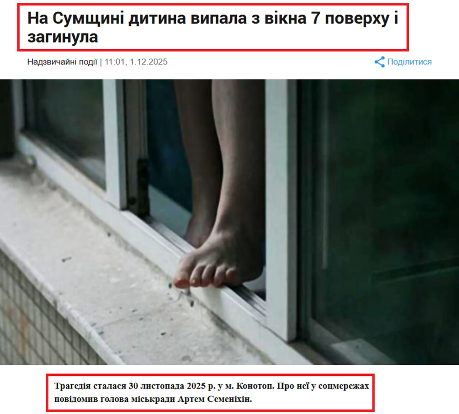 Russian propagandists on Telegram channels and Facebook are circulating a screenshot of a supposed news story from a regional media outlet in Sumy region. The publication claims that a soldier allegedly “threw a child out of a seventh-floor window.”
