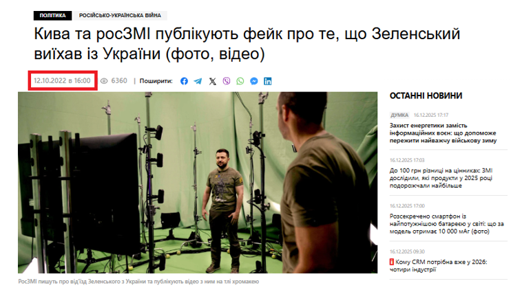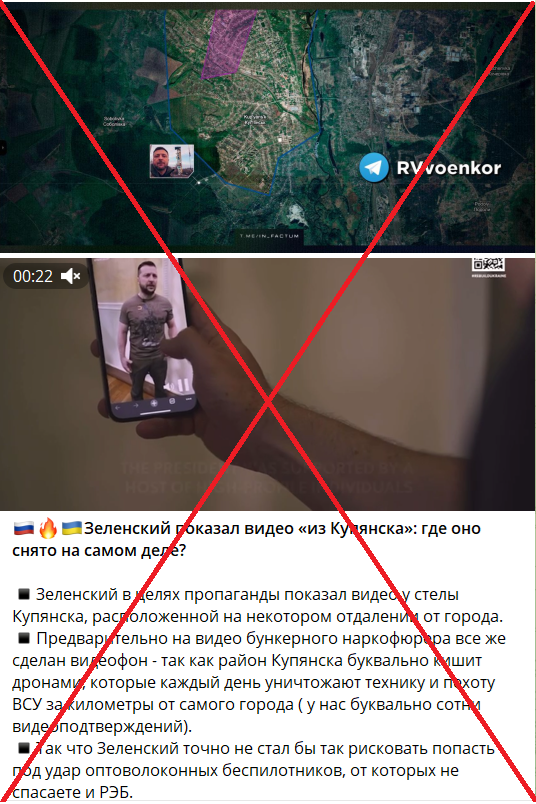 In addition, Russian Telegram channels are spreading claims that Volodymyr Zelensky did not actually visit Kupiansk and that the video was allegedly filmed using chroma key technology. As “evidence,” propagandists presented a video showing the President of Ukraine in a filming studio. They claim that the video near the stele was supposedly recorded at the American studio Lucasfilm, where Star Wars was filmed.