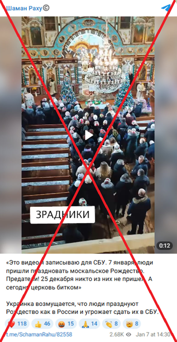 Russian Telegram channels are circulating a video of a service in one of Ukraine’s churches. A female voiceover claims that the video was recorded for the Security Service of Ukraine (SSU), alleging that on January 7 “people came to church to celebrate ‘Soviet’ Christmas” and are therefore “traitors,” while supposedly no one attended the service on December 25.
