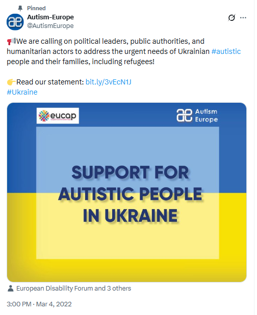 In contrast, Autism-Europe's X page has pinned, since March 2022, a post calling for the protection and support of people with autism in Ukraine affected by Russian aggression.