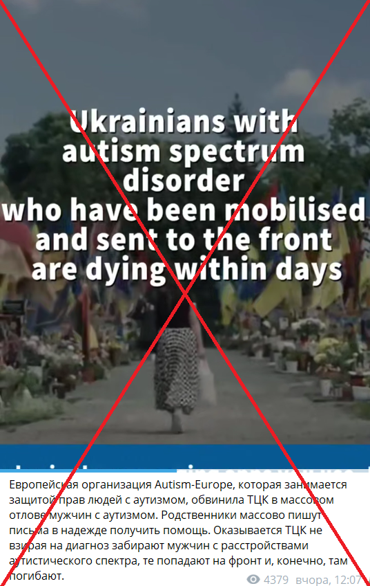 In addition, Russian Telegram channels circulated a video bearing the logo of the international organization Autism-Europe, which advocates for the rights of people with autism. The clip falsely claims that people with autism are being mass-mobilized in Ukraine and that their relatives are "sounding the alarm."