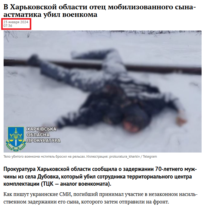 Russian media outlets, Telegram channels, and bots on X have been circulating false information, allegedly from the Kharkiv Regional Prosecutor's Office, claiming that a military recruitment officer was killed. The reports suggest that a suspect in the crime is a man whose son was "forcibly mobilized" despite having severe asthma.