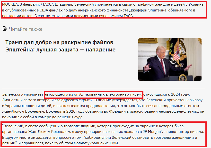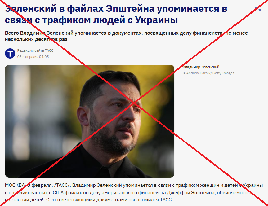 The Russian state propaganda agency TASS and the Kremlin-linked network of Telegram channels are spreading claims that the so-called “Epstein files” allegedly contain references to a “connection” between Ukrainian President Volodymyr Zelensky and human trafficking.