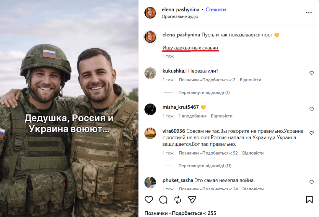 It should also be noted that the source of this fake is a social media user under the pseudonym elena_pashynina. She regularly publishes manipulative posts that justify Russian aggression. In particular, she has shared AI-generated images depicting alleged “friendship” between Russian and Ukrainian soldiers.