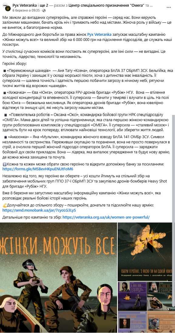 The goal of the campaign is to raise 6 million hryvnias. These funds are intended to support mobile air defense groups of the 37th Separate Marine Brigade of the Armed Forces of Ukraine, where a representative of the “Veteranka” movement with the call sign “Ksena” serves, as well as to purchase Heavy Shot bomber drones for the “Rubizh” Brigade, where another member of the community, “Yunha,” serves. Both servicemembers became the faces of the campaign.