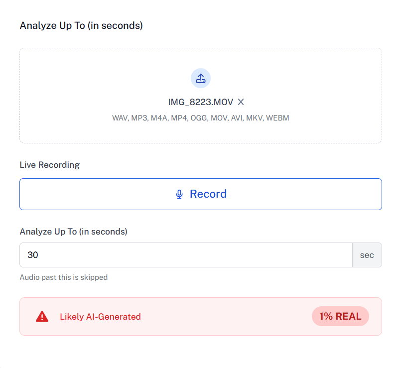 The original audio track was replaced with an AI-generated voice. The video file is titled "IMG_8223," and analysis by the Undetectable.ai service indicates with 99% probability that the voice is synthetic.