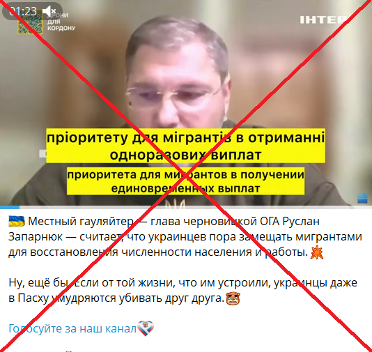 Russian resources, propaganda Telegram channels, and bot accounts on Instagram are spreading a video bearing the logo of the Inter TV channel, featuring a fragment of an interview with former head of the Chernivtsi Regional Military Administration, Ruslan Zaparaniuk. The video alleges that migrants would be granted employment benefits in the region, that women would receive payments for marrying foreigners, and that quotas would be introduced for leadership positions in settlements where foreign citizens form a majority.