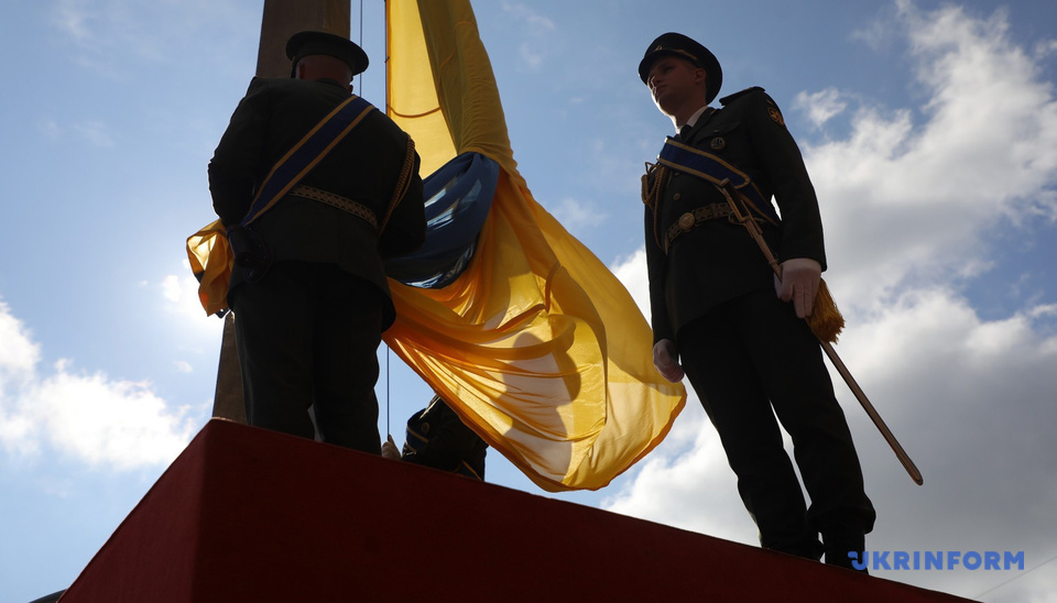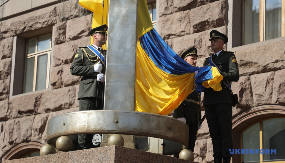 Ukrainian flag solemnly raised near city hall in Kyiv